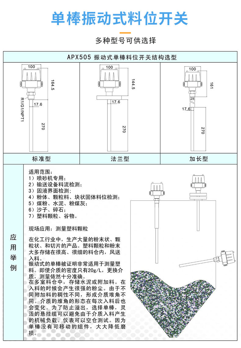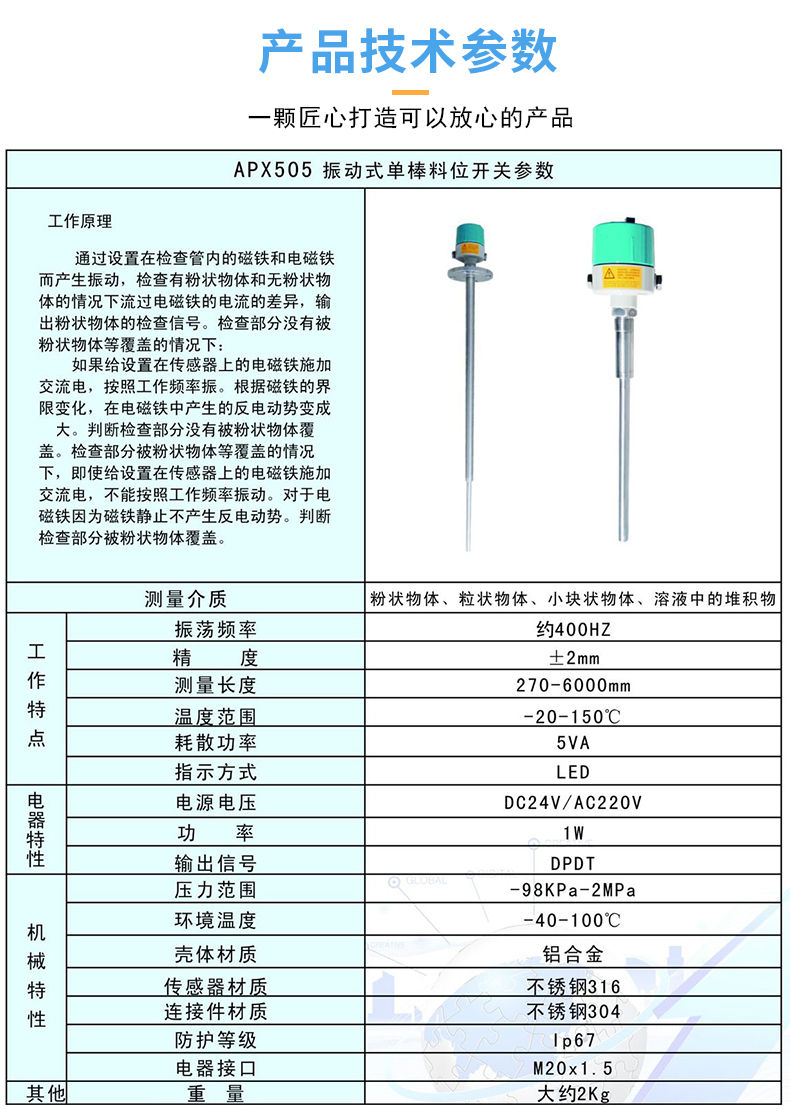 單棒式振動物位開關是通過壓電晶體的諧振來引起其振動的,當受到物料阻尼作用時,振幅急劇降低且頻率和相位發生明顯變化,這些變化會被內部電子電路檢測到,經過處理后,轉換成開關信號輸出。該產品可以對料罐的高低位進行檢測、控制和報警,適用于各種液體、粉末、顆粒狀固體。它實用簡單、運行可靠、適用性強基本上是免維護的、音叉和輸出均有工作狀態,均用發光二極管指示,可依據習慣調整狀態指示,并配有三種輸入方式(直流24V、交流110V和交流220V)和多種輸出方式(直流電流輸出型、繼電器接點輸出型、直流電壓輸出型)。所有類型均有高或低故障報警模式和可選擇的儀表開關靈敏度。