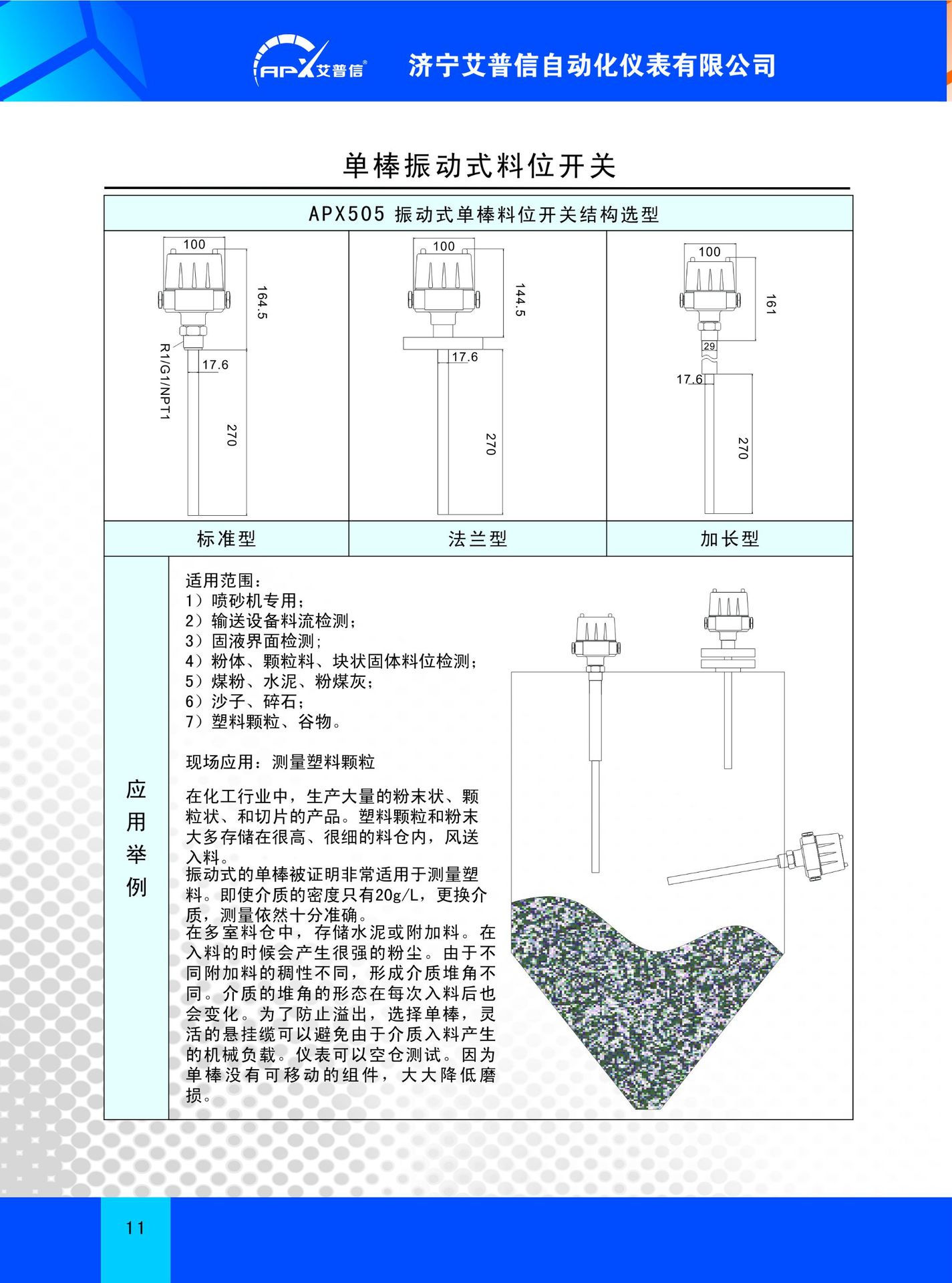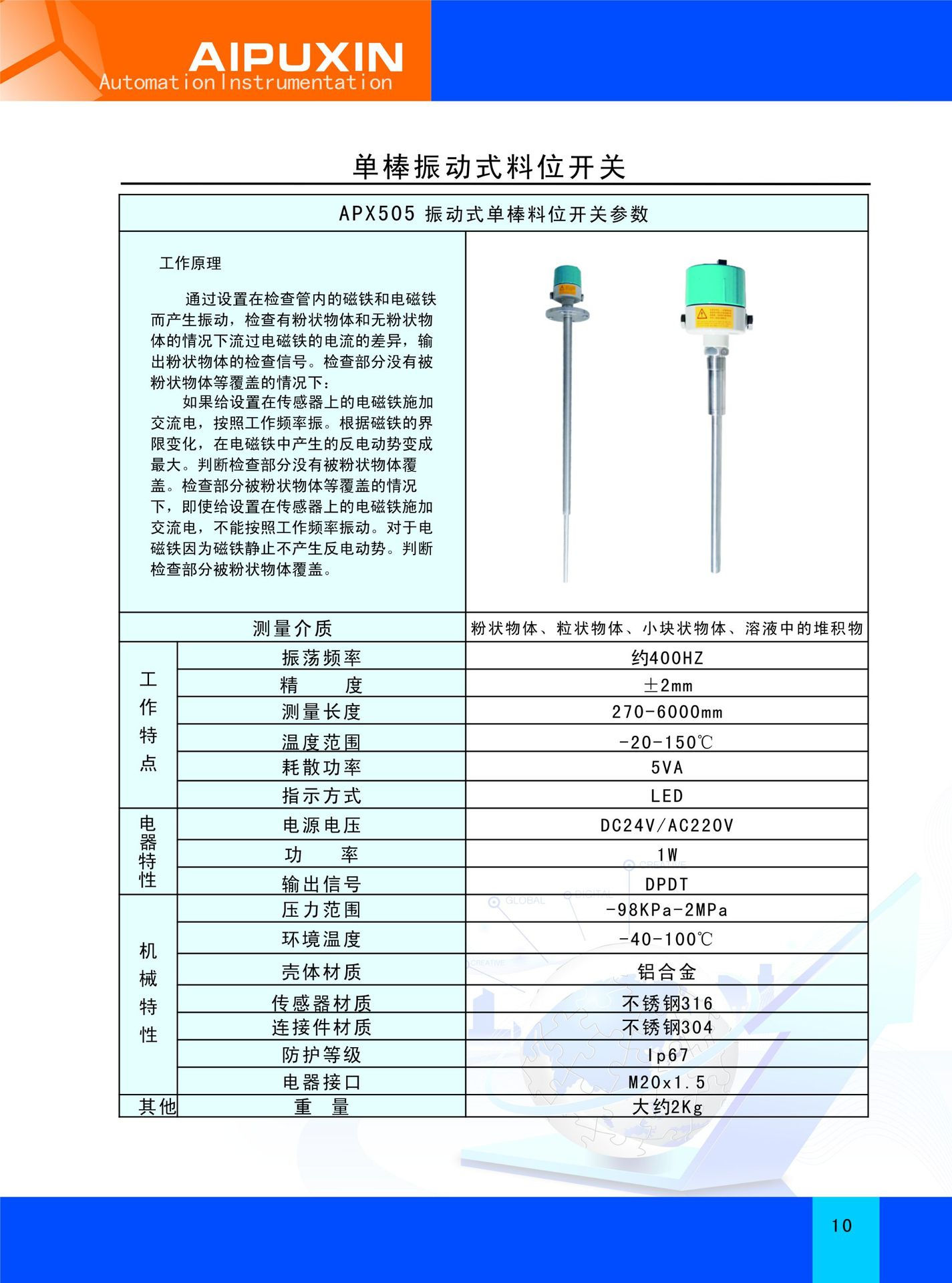 單棒式振動物位開關是通過壓電晶體的諧振來引起其振動的,當受到物料阻尼作用時,振幅急劇降低且頻率和相位發生明顯變化,這些變化會被內部電子電路檢測到,經過處理后,轉換成開關信號輸出。該產品可以對料罐的高低位進行檢測、控制和報警,適用于各種液體、粉末、顆粒狀固體。它實用簡單、運行可靠、適用性強基本上是免維護的、音叉和輸出均有工作狀態,均用發光二極管指示,可依據習慣調整狀態指示,并配有三種輸入方式(直流24V、交流110V和交流220V)和多種輸出方式(直流電流輸出型、繼電器接點輸出型、直流電壓輸出型)。所有類型均有高或低故障報警模式和可選擇的儀表開關靈敏度。