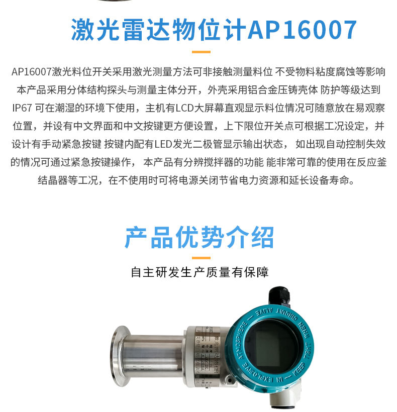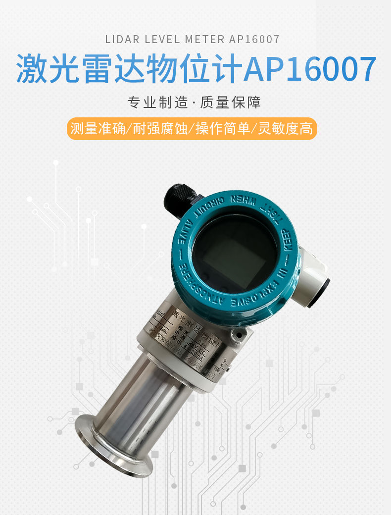 AP16007激光雷達(dá)物位計(jì)采用激光測(cè)量方法可非接觸測(cè)量料位,不受物料粘度腐蝕等影響,防護(hù)等級(jí)達(dá)到IP67可在潮濕的環(huán)境下使用,主機(jī)有LCD直觀顯示液位情況可隨意放在易觀察位置,設(shè)有人機(jī)界面更方便設(shè)置,本產(chǎn)品有分辨攪拌器的功能,能非常可靠的使用在反應(yīng)釜結(jié)晶器等工況。