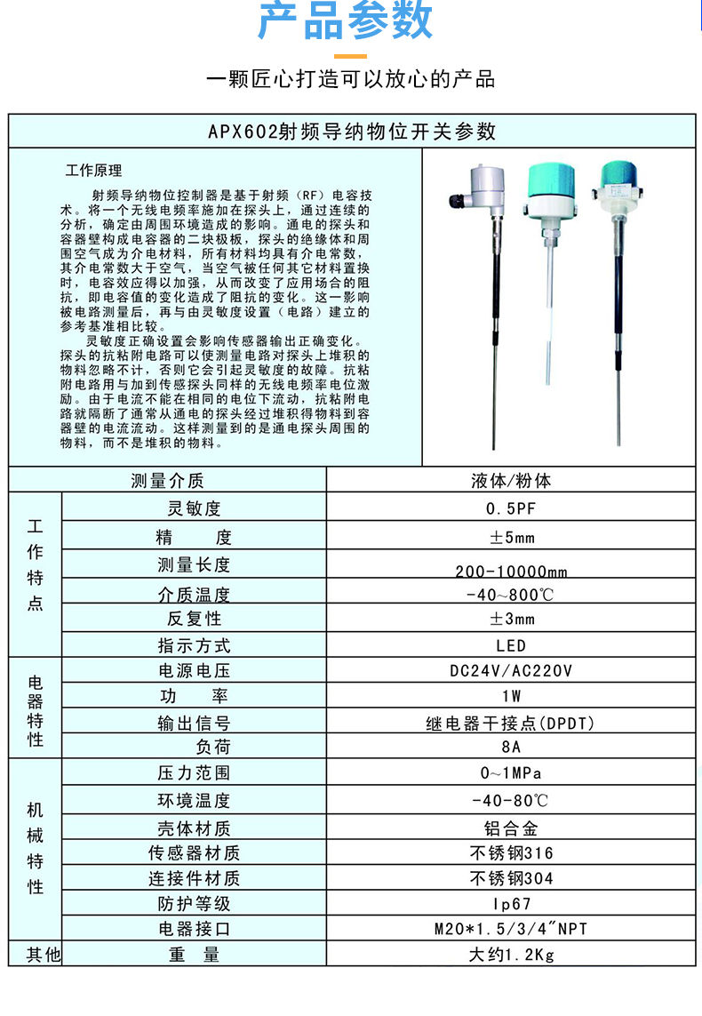 射頻導納開關采用智能微處理器元件及差值測量技術,可以測量水,油漆,污水,泥漿,等液體,小麥,稻谷,沙子,水泥,金剛砂,玻璃,金屬粉,等粉料尤其是可有效精確的測量強腐蝕性介質,可對環境變化和掛料進行動態補償。