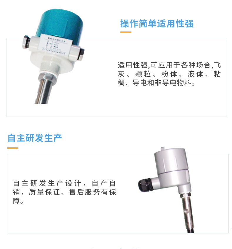 射頻導納開關采用智能微處理器元件及差值測量技術,可以測量水,油漆,污水,泥漿,等液體,小麥,稻谷,沙子,水泥,金剛砂,玻璃,金屬粉,等粉料尤其是可有效精確的測量強腐蝕性介質,可對環境變化和掛料進行動態補償。