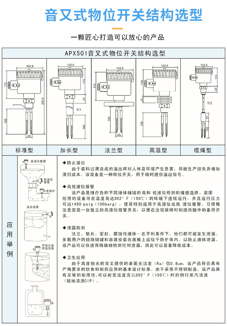 ?音叉開關是由壓電晶體與叉體諧振原理設計,通過感應叉體頻率及相位的變化進行前端信號采集,經由集成電路、單片機處理轉換為開關信號進行輸出的測量單元。廣泛應用于化工等工業生產,對物料高低位的自動控制、泵與閥的自控系統等自動化控制場所。適用各種液體、顆粒狀固體、漿液、粉末狀物料環境。該產品適應性強,穩定性好,惡略環境亦可正常使用。一經安裝不需維護,操作簡便,不需調校,為現場提供極大便利。