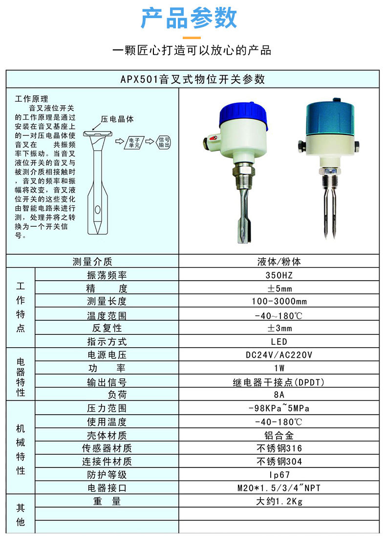 ?該產(chǎn)品可以對料罐的高低位進(jìn)行檢測、控制和報(bào)警,適用于各種液體、粉末、顆粒狀固體。它實(shí)用簡單、運(yùn)行可靠、適用性強(qiáng)基本上是免維護(hù)的、音叉和輸出均有工作狀態(tài),均用發(fā)光二極管指示,可依據(jù)習(xí)慣調(diào)整狀態(tài)指示,并配有三種輸入方式(直流24V、交流110V和交流220V)和多種輸出方式(直流電流輸出型、繼電器接點(diǎn)輸出型、直流電壓輸出型)。所有類型均有高或低故障報(bào)警模式和可選擇的儀表開關(guān)靈敏度。
