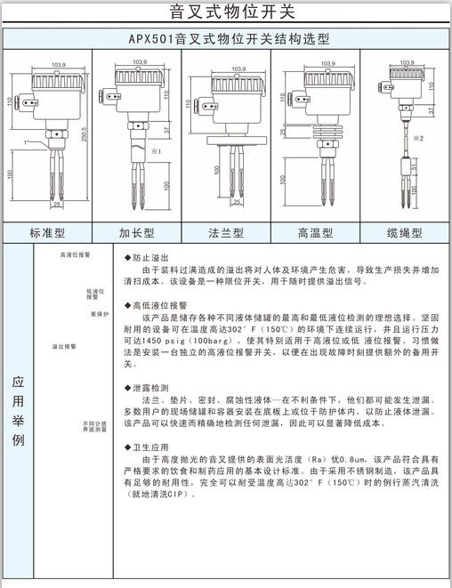 是通過壓電晶體的諧振來引起其振動(dòng)的,當(dāng)受到物料阻尼作用時(shí),振幅急劇降低且頻率和相位發(fā)生明顯變化,這些變化會(huì)被內(nèi)部電子電路檢測(cè)到,經(jīng)過處理后,轉(zhuǎn)換成開關(guān)信號(hào)輸出。該產(chǎn)品可以對(duì)料罐的高低位進(jìn)行檢測(cè)、控制和報(bào)警,適用于各種液體、粉末、顆粒狀固體。它實(shí)用簡(jiǎn)單、運(yùn)行可靠、適用性強(qiáng)基本上是免維護(hù)的、音叉和輸出均有工作狀態(tài),均用發(fā)光二極管指示,可依據(jù)習(xí)慣調(diào)整狀態(tài)指示,并配有三種輸入方式(直流24V、交流110V和交流220V)和多種輸出方式(直流電流輸出型、繼電器接點(diǎn)輸出型、直流電壓輸出型)。所有類型均有高或低故障報(bào)警模式和可選擇的儀表開關(guān)靈敏度。